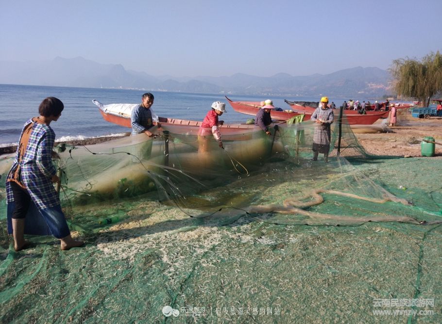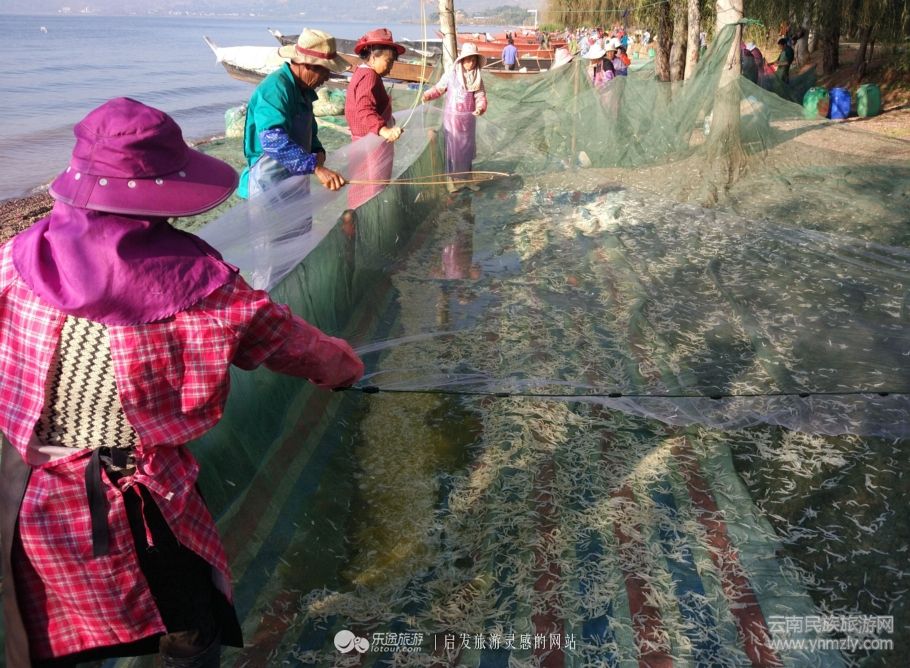如果沒(méi)有更多奇妙的事也就枉為撫仙湖,知道了鱇蒗魚(yú)的捕魚(yú)方式還不算了解高原明珠,只有了解了撫仙湖銀魚(yú)是如何從浩瀚的湖水里來(lái)到餐桌上,才算一飽眼福,銀魚(yú)因?yàn)槌驳倪m應(yīng)性和繁殖能力在撫仙湖是可以定期捕撈的,夜晚漁民將網(wǎng)撒在湖里,開(kāi)啟燈光誘捕銀魚(yú),早晨開(kāi)始起網(wǎng),看漁民們手持魚(yú)拍不斷地?fù)舸驖O網(wǎng),小小的銀魚(yú)上下紛飛,最終落下來(lái),越積越多,男男女女在勞作中猶如從事藝術(shù)表演,有韻律,有意境,有歡樂(lè),撫仙湖畔的銀魚(yú)捕撈就是一幅風(fēng)情畫(huà)。