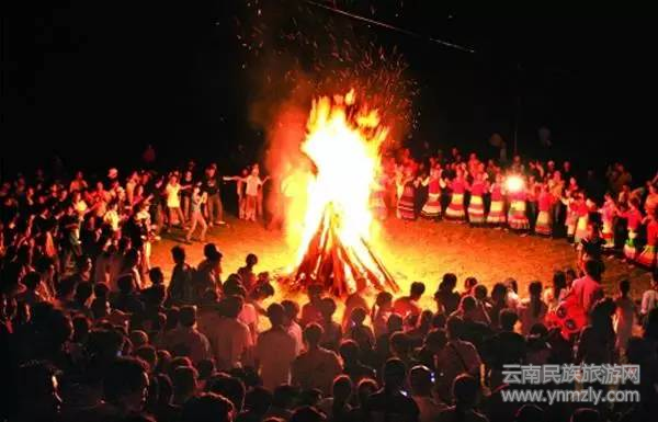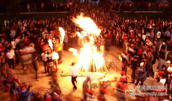 白族古有崇拜火的習俗,火把節(jié)白語稱“富物”,每年的農(nóng)歷六月二十五日是白族的火把節(jié),每到這一天,在本村壩中豎一高大的火把,平年扎12臺,閏年扎13臺,頂端扎一面旗幟,上面寫“風調(diào)雨順”、“五谷豐登”的字樣,下懸花紅、梨子、銅錢等物,用來象征美好的意義以及大家對未來的憧憬與希望。