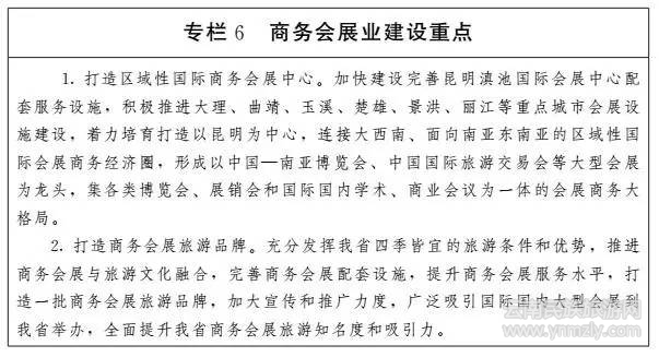 充分利用我省獨(dú)特的沿邊區(qū)位優(yōu)勢(shì)及發(fā)展商務(wù)會(huì)展的良好基礎(chǔ)條件,以昆明、大理、玉溪、曲靖、楚雄、景洪、麗江等重點(diǎn)城市為依托,加快昆明滇池國(guó)際會(huì)展中心等會(huì)展設(shè)施建設(shè),著力辦好中國(guó)—南亞博覽會(huì)和中國(guó)國(guó)際旅游交易會(huì),積極組織招徠大型商務(wù)會(huì)展活動(dòng),不斷提高商務(wù)會(huì)展服務(wù)水平,把我省建設(shè)成為我國(guó)面向南亞東南亞的區(qū)域性國(guó)際商務(wù)會(huì)展中心。鼓勵(lì)支持跨國(guó)集團(tuán)、大企業(yè)集團(tuán)以我省為總部基地,舉辦面向南亞東南亞的各類重點(diǎn)展會(huì)、大型會(huì)議和獎(jiǎng)勵(lì)旅游等。充分利用全省各地文物博物館和文物藏品,舉辦情趣高雅、寓教于樂,群眾喜歡、游客慕名而來(lái)的各類文博展覽會(huì)等。積極引進(jìn)國(guó)內(nèi)外知名會(huì)展企業(yè)來(lái)滇創(chuàng)辦會(huì)展企業(yè),鼓勵(lì)社會(huì)資本進(jìn)入會(huì)展行業(yè),打造策劃、代理、廣告、宣傳、工程等會(huì)展全產(chǎn)業(yè)鏈產(chǎn)品,培育提升“南博會(huì)”“旅交會(huì)”“農(nóng)博會(huì)”“文博會(huì)”等一批國(guó)際商務(wù)會(huì)展品牌,不斷提高商務(wù)會(huì)展品牌價(jià)值和效益。