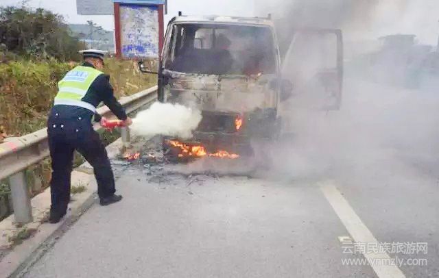 大隊民警首先到達現(xiàn)場,發(fā)現(xiàn)一輛號牌為云DMO2**的小型貨車已大面積燃燒,現(xiàn)場濃煙滾滾,情況十分危急。民警迅速安排一組對現(xiàn)場進行管控,在來車方向設(shè)置安全防護措施,提醒后方來車減速,注意行車安全,同時其余民警利用隨車攜帶的滅火器嘗試滅火,但因火勢太大無法成功,只能等待救援人員前來滅火。