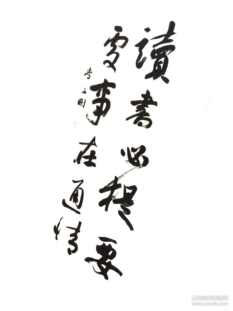 李小剛崇尚自然,敬畏自然,以一種淳樸的方式體悟自然,這樣的理念貫穿于他的書法藝術追求,故他的作品不著俗痕。他的作品,剛勁有力,骨力畢現(xiàn),又不乏鮮明的個性特色,往往把人帶入一種特有的意境,令人賞心悅目。