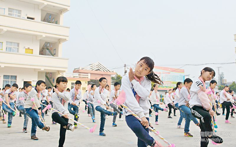 蒙自市草壩中心學(xué)校長期重視挖掘,整理,傳承民族文化精髓。本學(xué)期開始,把當(dāng)?shù)貍鹘y(tǒng)的彝族霸王鞭編成課間操,在全鎮(zhèn)10所完小中推廣,目的是讓師生在健身強(qiáng)體的課間操中傳承民族文化精髓。