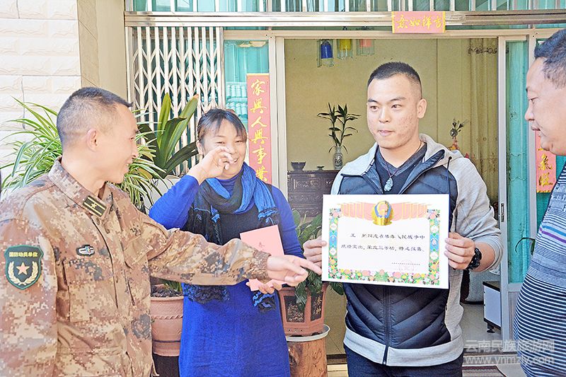 快到退伍戰(zhàn)士王魁家時,鞭炮聲和樂隊聲混雜在一起,猶如一曲交響曲吸引了不少觀眾,群眾得知是報喜也紛紛加入到隊伍中來。王媽媽和王魁聽到門外鑼鼓喧天的聲音立即開門,當(dāng)?shù)弥獔笙碴犖閬硪夂湍玫较矆髸r,王媽媽控制不住喜悅的心情。抹著熱淚對工作人員說,我兒子能從一個小青年成長為功臣,是部隊培養(yǎng)了他,教育了他,雖然他退伍了,你們還關(guān)心我們,非常非常感謝。王魁于2011年應(yīng)征入伍,系武警云南省邊防總隊某支隊檢查站原班長,入伍以來,他認(rèn)真學(xué)習(xí)政治理論,刻苦訓(xùn)練,作風(fēng)嚴(yán)謹(jǐn),工作踏實,認(rèn)真對過往人員車輛進(jìn)行嚴(yán)密檢查,與戰(zhàn)友密切協(xié)作,多次查獲冰毒、海洛因等毒品,在禁毒人民戰(zhàn)爭中成績突出,被記三等功一次?! ?/p>