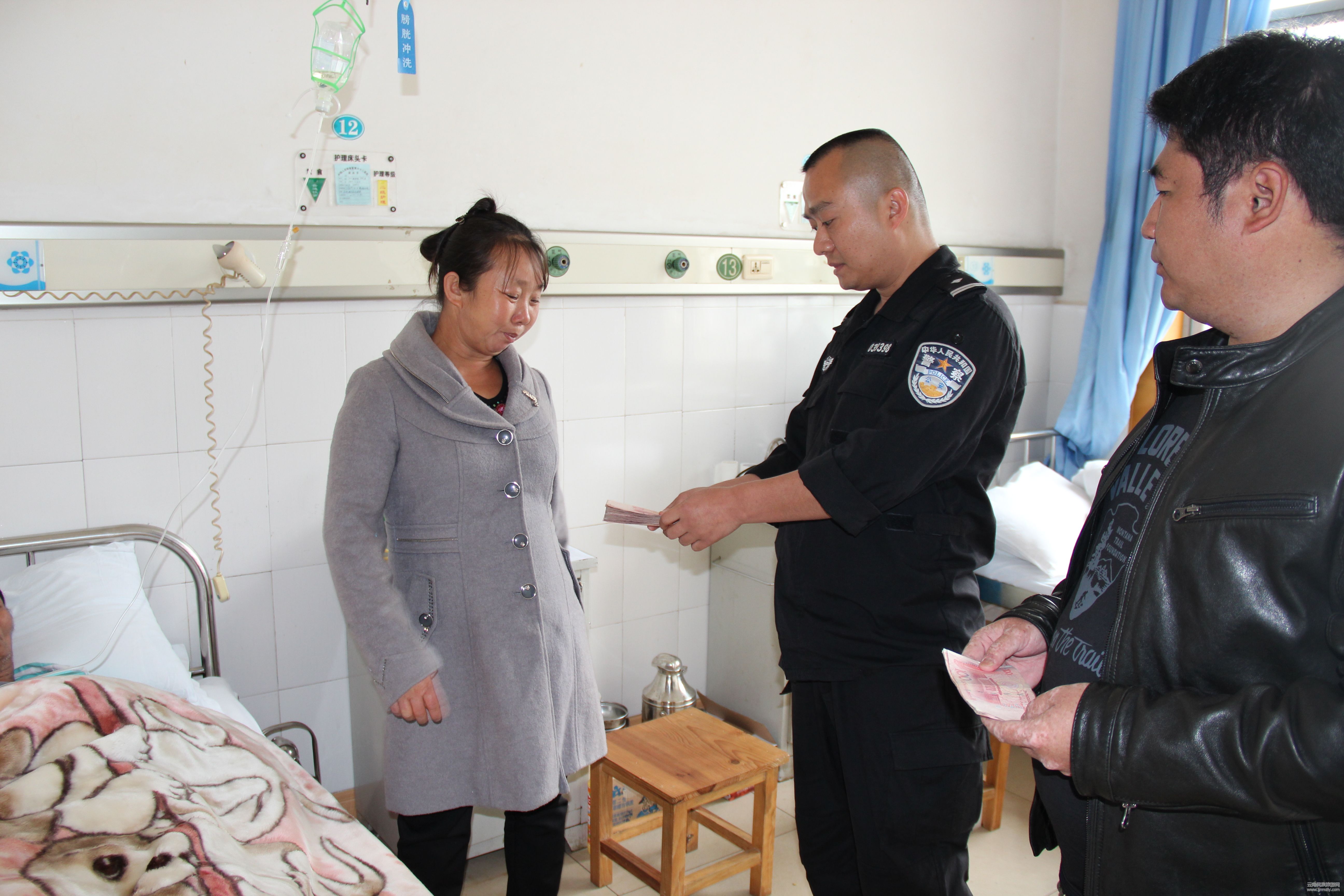 2016年12月中旬,黃樹祥的病情再度惡化,導(dǎo)致并發(fā)右腳小腿肌肉出現(xiàn)壞死。在民警的勸說下,一家人東拼西借籌集得幾萬元錢,帶著到昆明住院治療,經(jīng)過近一個月的治療,花費(fèi)醫(yī)療費(fèi)13萬余元,但出現(xiàn)肌肉壞死的右腿只能截肢處理,不然將直接威脅其生命健康。早已是多方舉債的老黃,2017年1月中旬,病情穩(wěn)定后,老黃只好轉(zhuǎn)院到離家更近的普洱市解放軍六十二醫(yī)院做手術(shù)。派出所所長莫曉斌、教導(dǎo)員吳俊得知老黃治病欠下的巨額債務(wù)后,心想這樣下去老黃將再度陷入貧困。但僅靠派出所幾名民警、協(xié)警的捐助,老黃也解決不了多大的困難。于是便在轄區(qū)范圍內(nèi),發(fā)動單位、企業(yè)及群眾中的愛心人士,向老黃捐款獻(xiàn)愛心。在短短的一周時間內(nèi)便籌集善款10000余元,1月24日所長莫曉斌、教導(dǎo)員吳俊專程趕到普洱市解放軍六十二醫(yī)院老黃的病房,看望慰問老黃一家人,把募捐到的11600元善款轉(zhuǎn)交給老黃的家人,鼓勵他要樹立信心,與病魔抗?fàn)?,早日康?fù)。