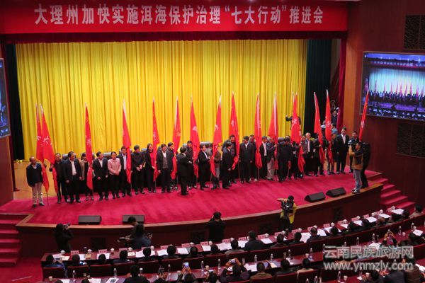 大理州政府副州長(zhǎng)楊承賢在推進(jìn)會(huì)上宣讀了《中共大理州委辦公室大理州人民政府辦公室關(guān)于成立洱海保護(hù)治理“七大行動(dòng)”指揮部和派駐工作隊(duì)的通知》,中共大理州委、州政府向大理州洱海保護(hù)治理“七大行動(dòng)”指揮部和16支工作隊(duì)授牌授旗。(記者 楊鳳池)
