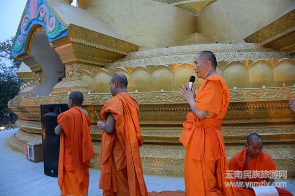 在莊嚴(yán)肅穆的誦經(jīng)聲中,高僧們合掌圍著金塔走過。虔誠的群眾在高僧走過時,用手里纖細的蠟燭點燃了擺在臺階上的燈盞。高僧們過后,一盞盞祈福燈亮起來,一圈圈、一層層的燈光像漣漪般蕩漾在金塔周圍。