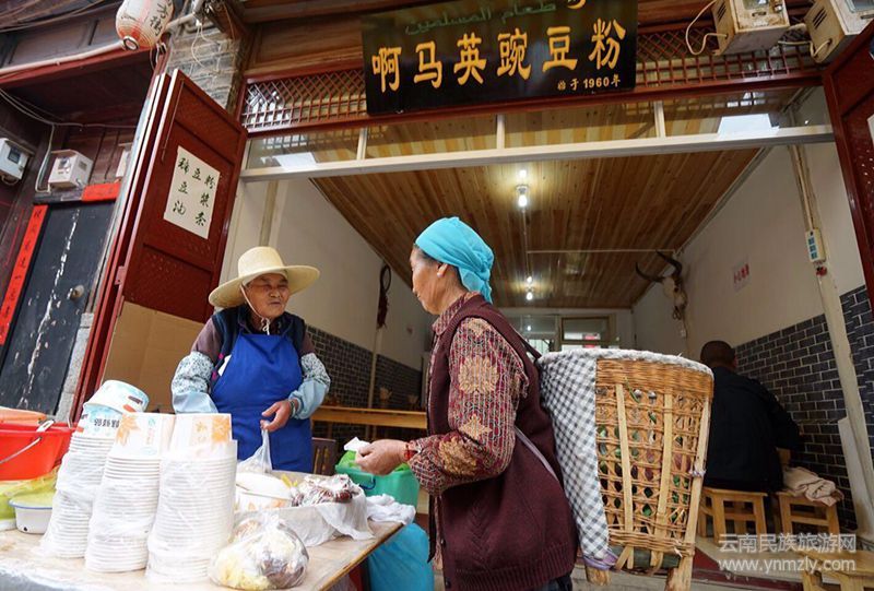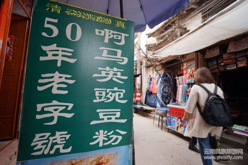 在大理喜洲鎮(zhèn)古城四方街旁,有家“啊馬英豌豆粉”小店,遠(yuǎn)近聞名,豌豆粉相當(dāng)好吃。