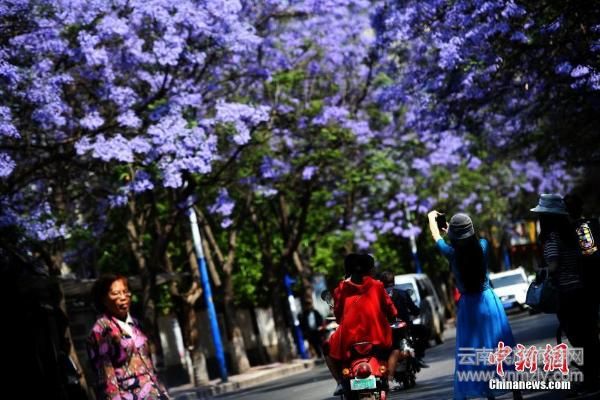 藍花楹盛放昆明街頭 市民穿行浪漫花街