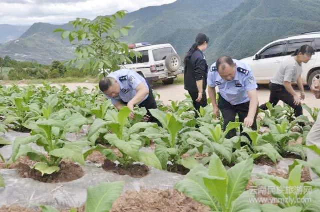 “這一大片煙地全是法念村的,最上面兩塊則是公安局幫助農(nóng)戶栽種的樣板煙,長勢都很不錯,大家邊看邊談吧。”雙柏縣公安局副局長、駐村工作隊隊長李曉燕引領(lǐng)著班子成員,邊走邊介紹,煙地里的黨委會從這就開始了……