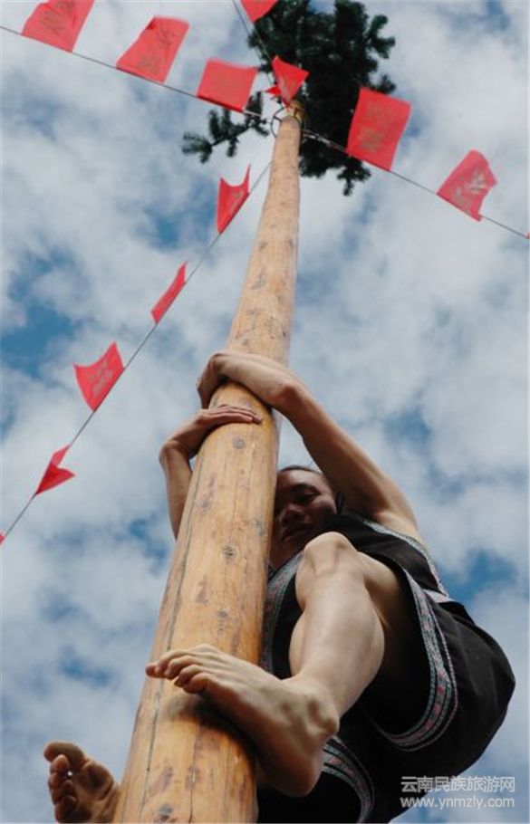 苗族的酒文化底蘊(yùn)深厚,客人在進(jìn)寨門之前,在高亢嘹亮的酒歌助興下,首先喝上一杯攔寨酒,方能入村做客。苗族長(zhǎng)老帶領(lǐng)自己的同胞在花桿下進(jìn)行祭拜“花桿儀式”,保佑倒爬花桿的小伙子們平安爬到桿頂,展示民間競(jìng)技的風(fēng)采。“倒爬花桿”是苗族獨(dú)有的民間競(jìng)技項(xiàng)目,在花山節(jié)場(chǎng)上,苗族小伙們鼓足勇氣、爭(zhēng)先恐后地展現(xiàn)自己的本領(lǐng),希望找到自己喜歡的姑娘。