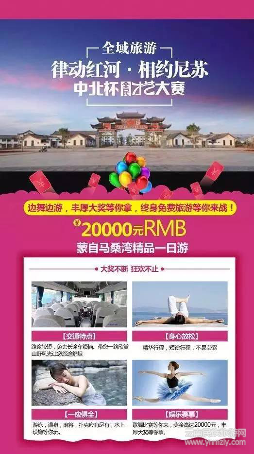 響應(yīng)了“活力蒙自”領(lǐng)導(dǎo)小組關(guān)于“周周有活動(dòng),月月有展演;季季有節(jié)慶”的要求,堅(jiān)持順應(yīng)全域旅游的發(fā)展趨勢(shì),做到不僅把游客送出去,還要把游客引進(jìn)來的雙向良性發(fā)展,拉動(dòng)蒙自區(qū)域內(nèi)各旅游相關(guān)產(chǎn)業(yè)的共同進(jìn)步。紅河州中北旅行社積極籌備了此次“活力蒙自”- “中北杯” 全民才藝大賽。