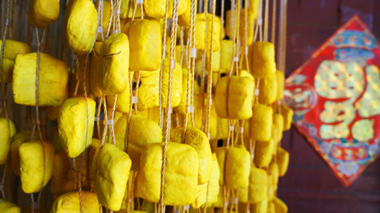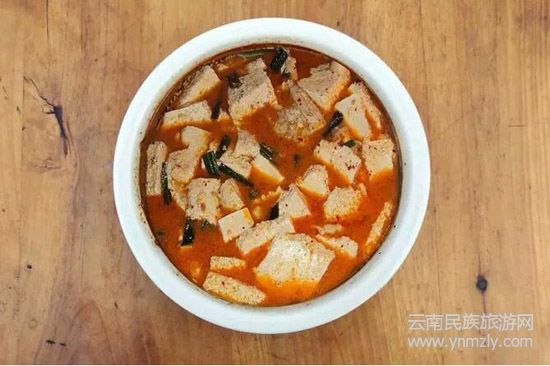 倘塘鎮(zhèn)是烏蒙山南段的一個小鎮(zhèn),以出產(chǎn)黃豆腐聞名。就像宣威火腿一樣,倘塘黃豆腐把地名和特產(chǎn)連在一起稱呼。而這里突出的是一個“黃”字,我們常見到的大多是白豆腐,這種豆腐卻是黃色,方方兩寸。看之,嬌嫩欲滴,食欲大增;食之,滋嫩可口,滿口留香。生食,質(zhì)脆味鮮,止渴生津;切片打蘸涼食,質(zhì)韌香醇;割塊炒食,黃色不染,其香繞梁;成塊煎食,油而不膩,溫潤不火;燒烤干蘸,熱血潤肺,舒筋暖胃;拌酸菜煮食,清爽開胃,消暑解渴;登得喜宴,伴得旅途。