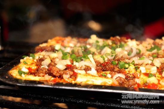 在石屏,豆腐被當(dāng)作贈送遠(yuǎn)親招待客人的上好禮品。石屏豆腐,可炸,可煮,可蒸,可炒,可烤,似乎任何一種烹飪技法都可以用在石屏豆腐上。但是,烤的豆腐深得當(dāng)?shù)厝讼矏?。用來烤的石屏豆腐一定要用新鮮的并在通風(fēng)的環(huán)境下晾曬2~3天,讓豆腐本身的水分徹底的晾干,并讓它自然“長毛”,發(fā)“臭”,再用木炭文火慢慢翻烤,這樣的燒豆腐皮黃而不焦,膨脹如皮球,熟透后氣孔如麻,聞著臭吃著香,口感細(xì)膩,讓人大開胃口。