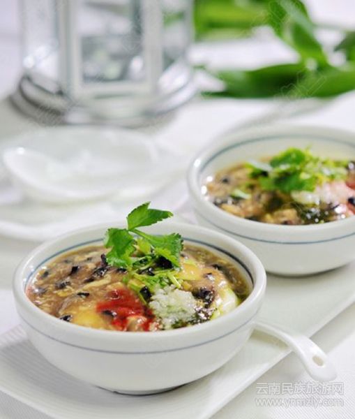 菜豆花,顧名思義,就是混有蔬菜的豆腐腦。菜豆花的制作流程簡單,選取上好的黃豆加水泡上一夜,磨成漿,濾去渣,將過濾過的濃漿用大火煮沸,投好切碎的白菜,改為小火慢慢地煮,鍋里的豆?jié){就會慢慢浮起,逐漸與菜一起凝固,這樣即可做出美味的菜豆花。配個地道的蘸水,味道很是可口。