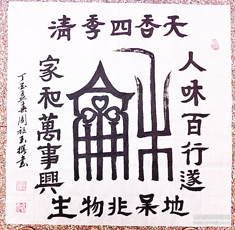 周祖玉說:“我觸及書法與家嚴(yán)的職業(yè)不無關(guān)系。兒時,我曾記得,在我家的堂屋正中張賬著用四尺半開紅紙書寫的‘天地國親師位’,兩邊分別貼著‘祖宗格言克勤克儉;子孫正路惟讀惟耕’的對聯(lián)。中堂之字端莊丶規(guī)整丶有骨丶有肉,嚴(yán)然不乏顏體風(fēng)格;對聯(lián)則淸秀丶雋永丶無媚丶無俗,依稀閃現(xiàn)黃楷影子。但凡文人雅士見到,總少不了贊賞幾句。家嚴(yán)也說:‘字是敲門錘’。一篇文章,如果字寫得好,先生或領(lǐng)導(dǎo)都不會隨便對待。”至此,周祖玉對漢字書寫便不敢馬虎了。