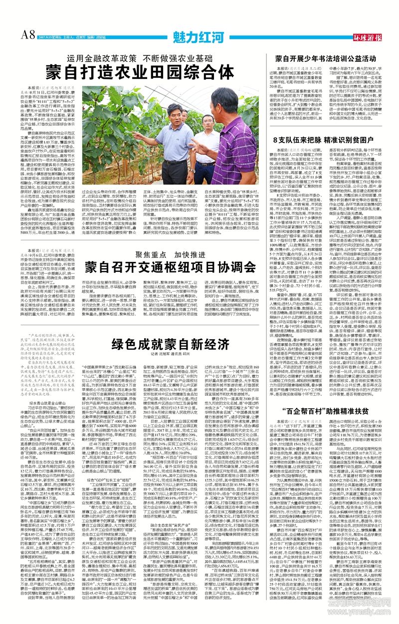 蒙自在踐行生態(tài)文明發(fā)展進程中,著力推進綠色發(fā)展、循環(huán)發(fā)展、低碳發(fā)展,堅持“生態(tài)建設產(chǎn)業(yè)化、產(chǎn)業(yè)發(fā)展生態(tài)化”原則,優(yōu)化調(diào)整產(chǎn)業(yè)結構、生產(chǎn)方式、生活方式,大力實施生態(tài)經(jīng)濟戰(zhàn)略,轉變經(jīng)濟發(fā)展方式,走出一條發(fā)展經(jīng)濟與保護生態(tài)并重的雙贏之路。