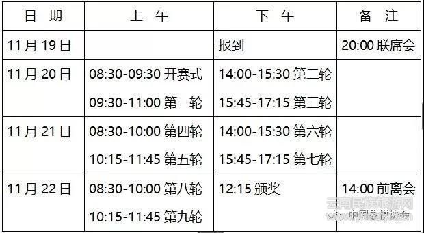 (二)報(bào)到時(shí)間和地點(diǎn):請(qǐng)參賽棋手于2017年11月19日下午2點(diǎn)至6點(diǎn)在大理懷仁酒店報(bào)到。19日20:00聯(lián)席會(huì)議(酒店7樓會(huì)議室)