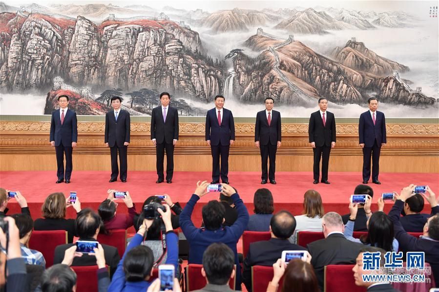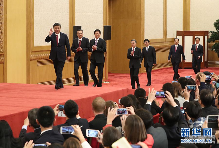 10月25日,剛剛在中共十九屆一中全會(huì)上當(dāng)選的中共中央總書記習(xí)近平和中央政治局常委李克強(qiáng)、栗戰(zhàn)書、汪洋、王滬寧、趙樂際、韓正在北京人民大會(huì)堂同采訪十九大的中外記者見面。新華社記者 李濤 攝