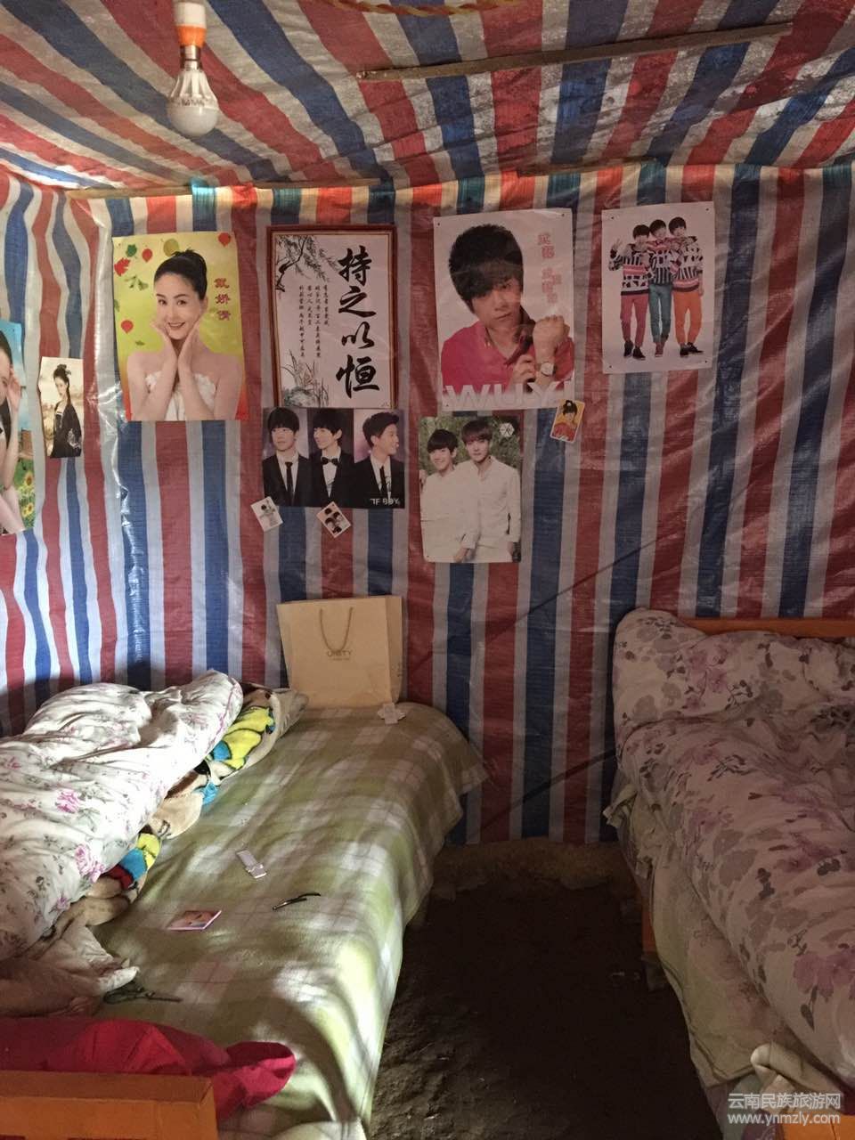家里有3間簡(jiǎn)陋的平房,左右兩間是姐弟倆的書房兼臥室,里面的彩條布是作為頂部防塵和墻面擋風(fēng)用的,姐姐的房里掛著張紙,上面寫著“認(rèn)真、刻苦、堅(jiān)持”,弟弟房間里貼著“持之以恒”四個(gè)字。房間極其簡(jiǎn)陋,但干凈整潔,透著一股濃濃的書香氣息。