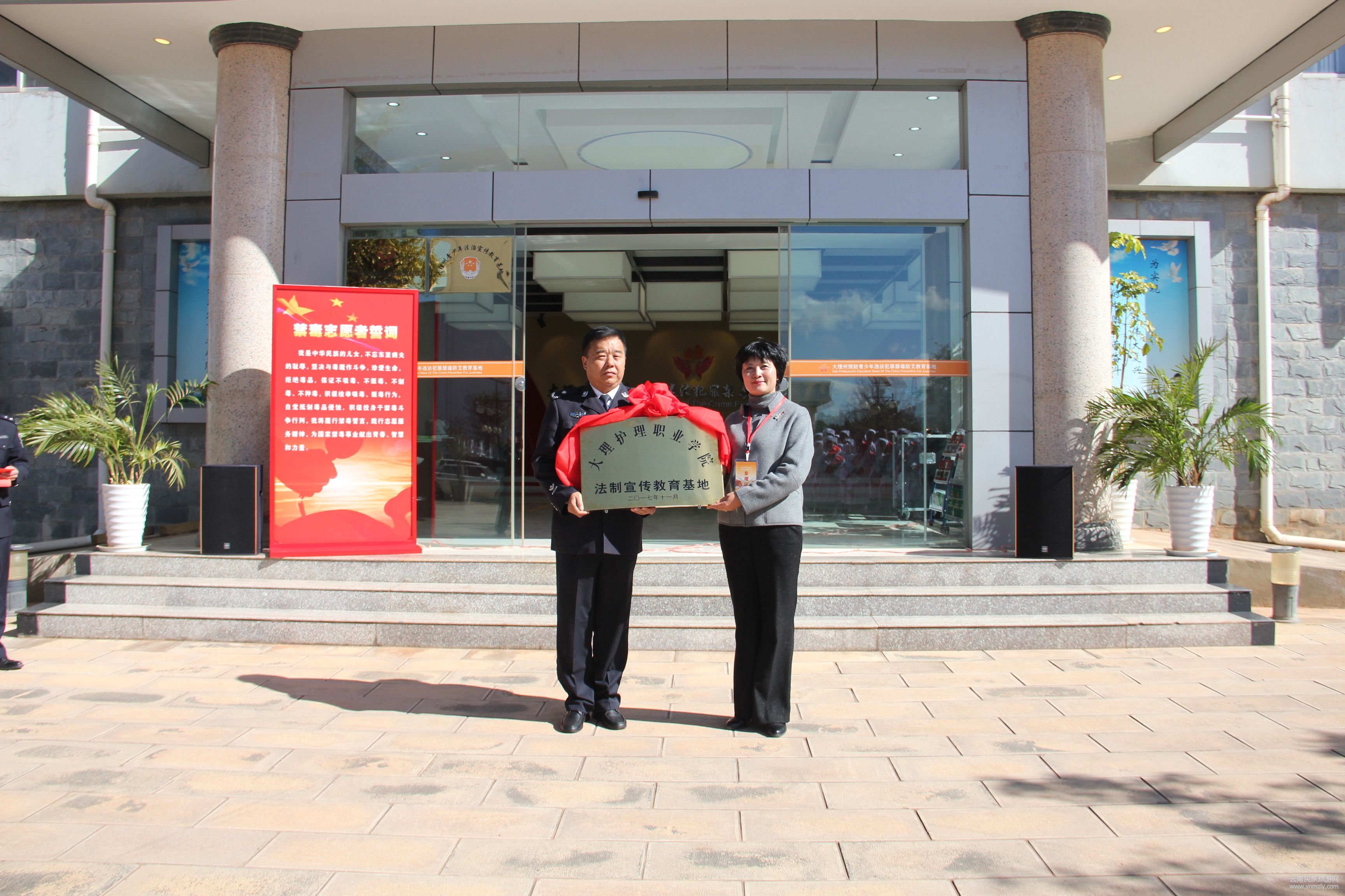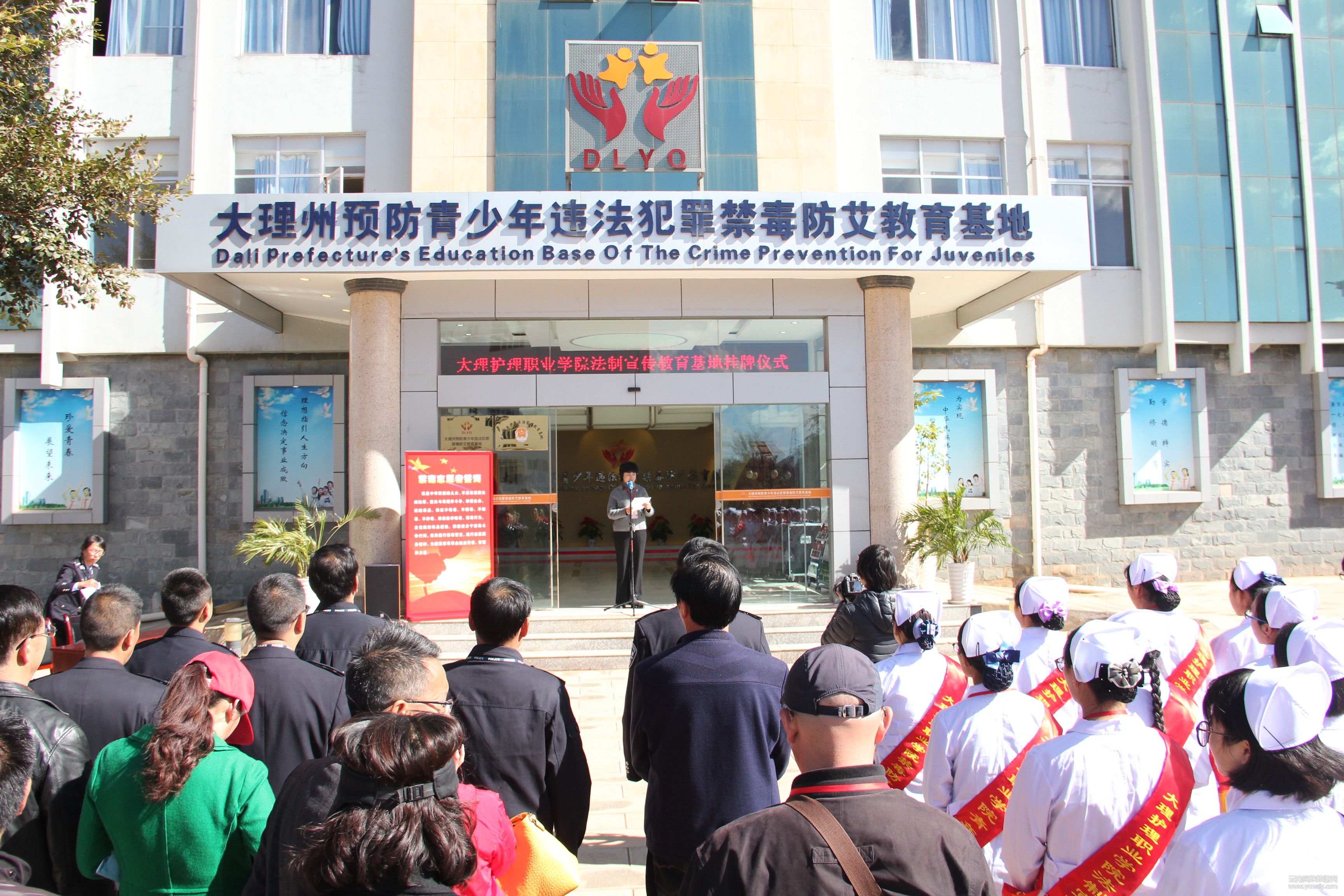 11月 28日下午,大理護(hù)理職業(yè)學(xué)院法制宣傳教育基地掛牌儀式大理州強(qiáng)制隔離戒毒所舉行。強(qiáng)戒所黨委書記、所長甘帆致歡迎詞;大理護(hù)理職業(yè)學(xué)院院長楊泓濤講話;大理護(hù)理職業(yè)學(xué)院學(xué)生代表作表態(tài)發(fā)言。大理州強(qiáng)制隔離戒毒所黨委委員、副所長趙錦治,大理護(hù)理職業(yè)學(xué)院副院長蔡德周,大理州強(qiáng)制隔離戒毒所黨委委員副政委和亮澤,大理護(hù)理職業(yè)學(xué)院教務(wù)處主任施龍華,大理州強(qiáng)制隔離戒毒所黨委委員、副所長董海斌等領(lǐng)導(dǎo)及大理護(hù)理學(xué)院教務(wù)處工作人員和100名學(xué)生代表參加了本次活動;所、校雙方領(lǐng)導(dǎo)簽訂合作協(xié)議并揭牌。