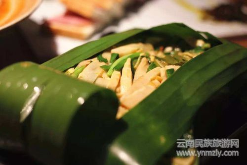 包燒是傣族人特色的烹飪方法,用來加工小菜、肉食等。用天然的芭蕉葉將食物包裹,放在炭火上燒烤,完全不用炊具,烤完的食物不干不焦、香氣撲鼻。