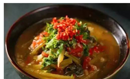 用番茄、酸木瓜片、檸檬等來調和苦味稍重的青菜,用肉湯熬煮一段時間,有湯有菜,酸辣開胃、特別下飯。