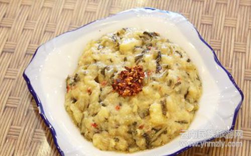 老奶洋芋相信很多人都吃過,但用水淹菜作調料是傣味吃法。酸菜的爽口遇上洋芋的軟綿,二者融合得恰到好處,中間再點綴上油辣椒、香蔥,胃口頓時大開。