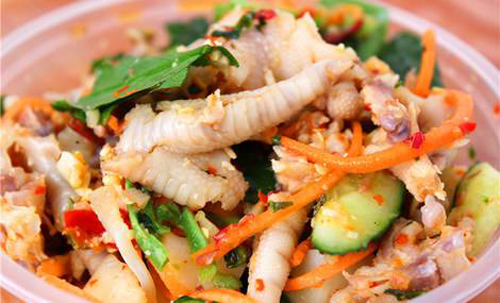 傣族人民喜好酸辣的食物,出生于涼拌類食品的品種繁多,舂雞腳也是一道熱門菜肴。煮熟涼好的雞腳和檸檬、花生米、洋蔥、辣椒等一起舂碎,酸、辣、滑、爽。