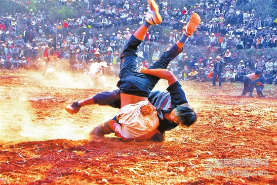 彌勒是以彝族為主的少數(shù)民族聚居區(qū)。如同在彝山,出生不久的駿馬就會(huì)奔跑一樣,彝族人的孩子剛會(huì)說話就學(xué)摔跤,在包谷地里摔,在麥秸堆上摔,在山崗草坡上摔,阿爺、阿爹在一旁耳提面命,言傳身教。百里彝山,摔跤英雄輩出。