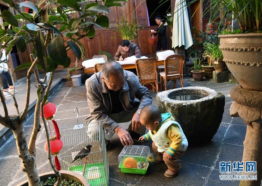 11月21日,和順古鎮(zhèn)一位老人在家里陪小孩玩耍。