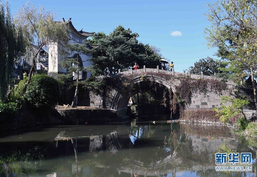 11月19日,游客在和順古鎮(zhèn)石拱橋上觀景。
