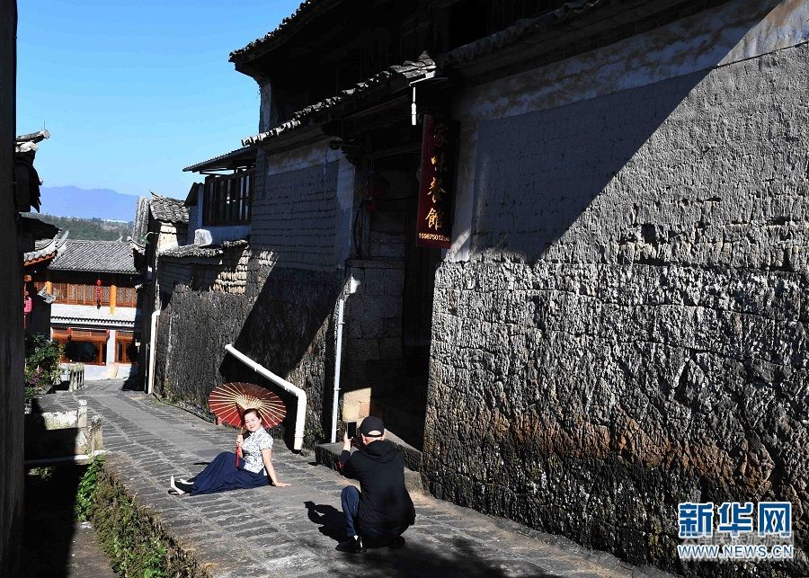 11月19日,游客在和順古鎮(zhèn)石板路上拍照。