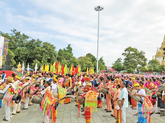 11月18日至19日 ,一場盛大的傣族傳統(tǒng)文化活動在梁河縣金塔廣場舉行。圖為該縣舉辦的首屆傣歷新年慶典,數(shù)千名群眾和中外嘉賓共赴此盛會。