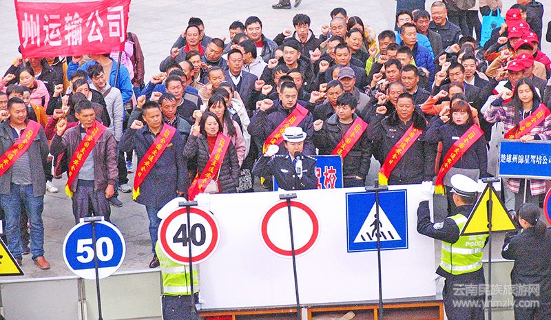 為進一步提升全民法治意識、安全意識,營造文明交通的社會氛圍,12月4日上午,楚雄州、市公安交警部門借12.4全國憲法日集中宣傳活動之機,在楚雄市桃園湖廣場開展2017年“122”全國交通安全日主活動,再次將122后延宣傳活動推向高潮,楚雄州市五家駕校100余名駕駛人參加了活動。