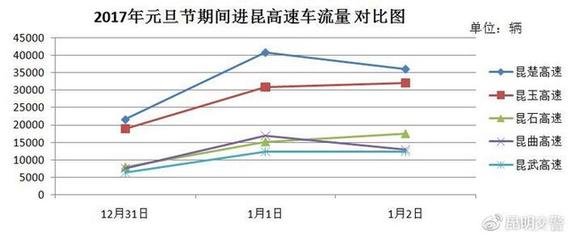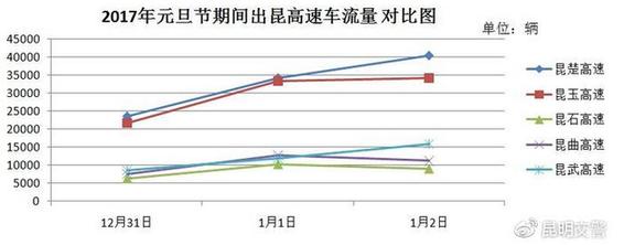 對(duì)比分析2017年元旦節(jié)假期昆明周邊主要高速車流量。如下圖:
