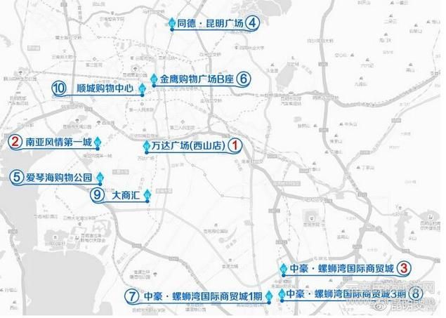 主城區(qū)內(nèi),預(yù)計(jì)元旦節(jié)期間在以下商業(yè)集中區(qū)會(huì)出現(xiàn)人、車流交通高峰:萬(wàn)達(dá)廣場(chǎng)(西山店)、南亞風(fēng)情第一城、中豪·螺螄灣國(guó)際商貿(mào)城、同德·昆明廣場(chǎng)、愛(ài)琴海購(gòu)物公園、金鷹購(gòu)物廣場(chǎng)B座、中豪·螺螄灣國(guó)際商貿(mào)城1期、中豪·螺螄灣國(guó)際商貿(mào)城3期、大商匯、順城購(gòu)物中心。
