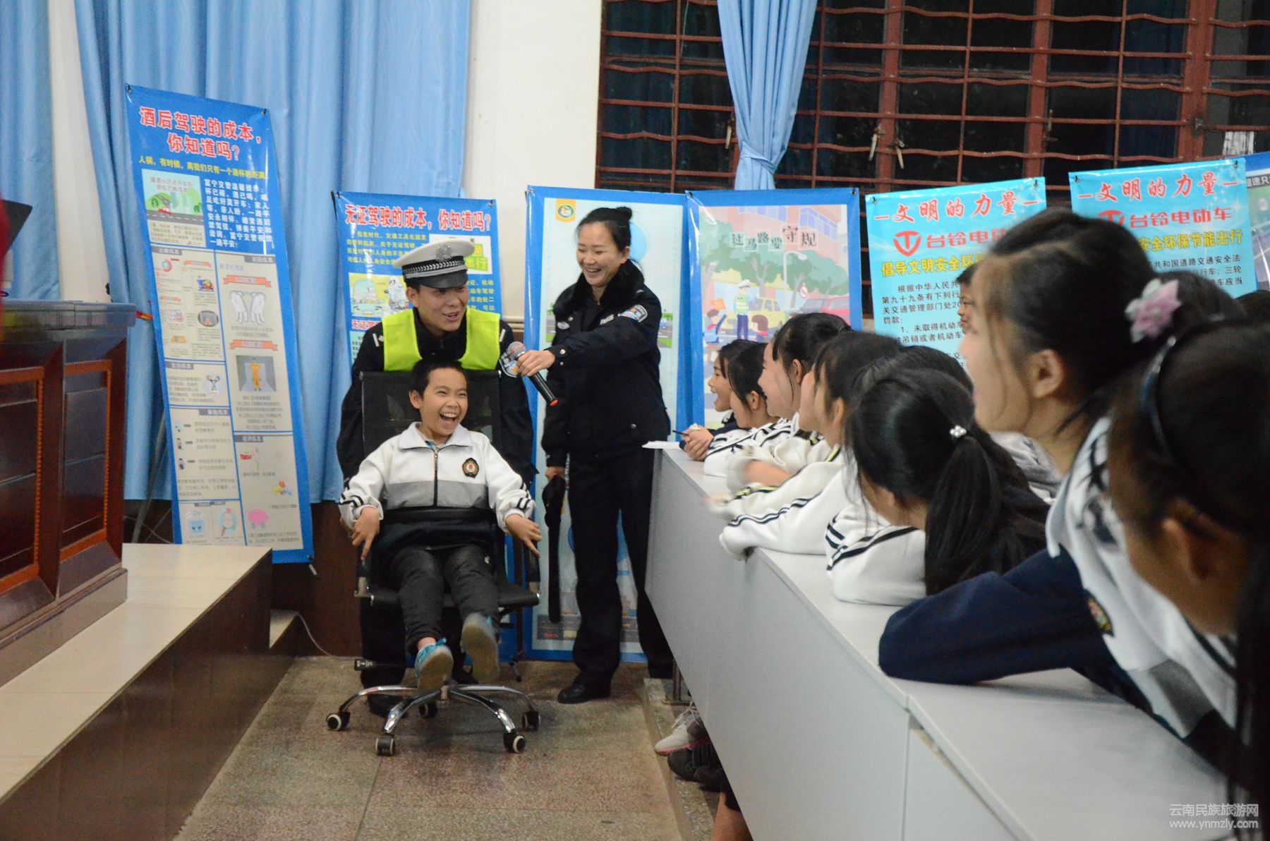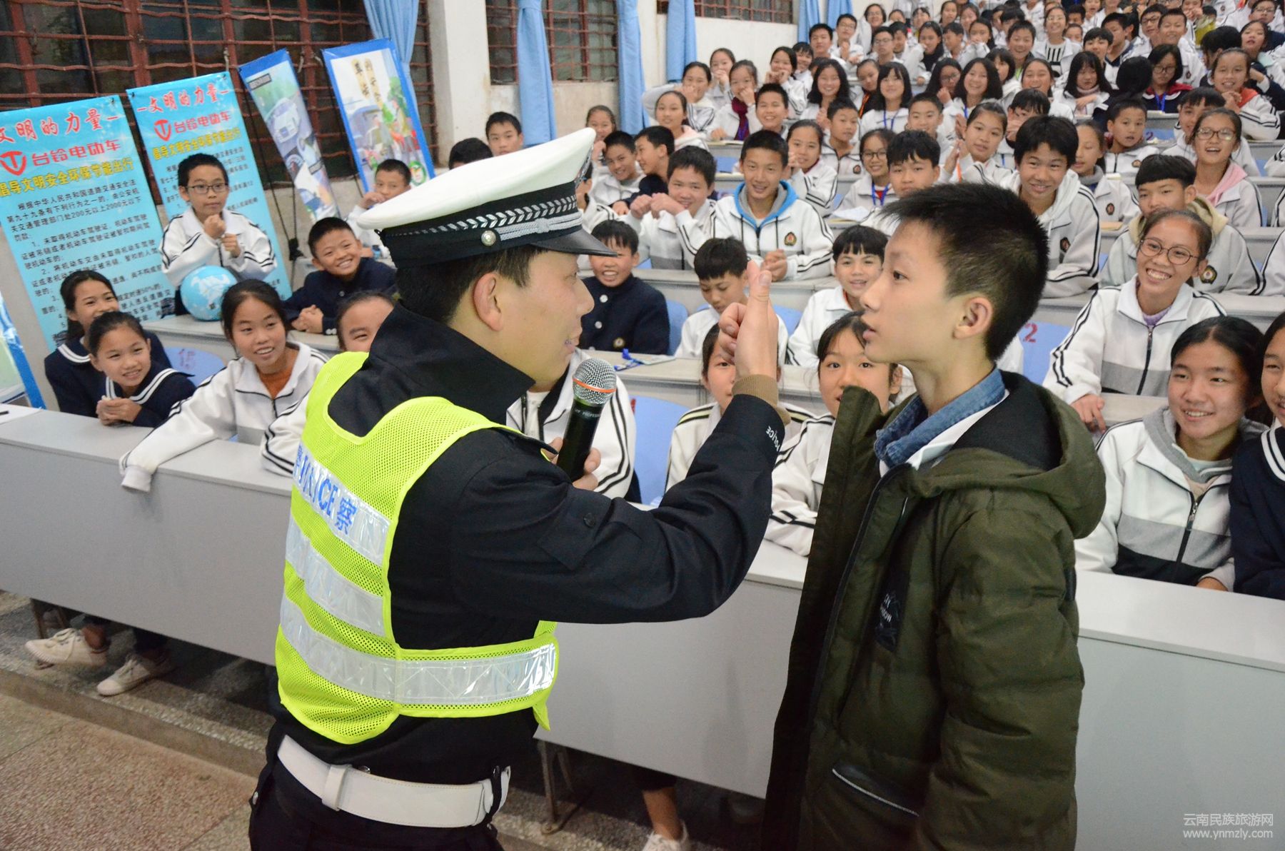 當(dāng)天晚上,宣傳民警首先通過(guò)PPT講解交通安全常識(shí)及涉及學(xué)生的典型交通事故案例,教育學(xué)生做文明人、行文明路,乘車、騎車要嚴(yán)格遵守道路交通安全法律、法規(guī)。同時(shí)針對(duì)學(xué)生出行的特點(diǎn),宣傳民警積極與現(xiàn)場(chǎng)學(xué)生互動(dòng),通過(guò)3個(gè)模擬小實(shí)驗(yàn)來(lái)讓學(xué)生感受遵守道路交通安全法律法規(guī)的重要性。首先用頭盔包住西瓜從高空摔下對(duì)比不帶安全頭盔的西瓜從高空摔下時(shí)的狀態(tài),警示教育駕乘摩托車佩戴安全頭盔的重要性。再來(lái),抽取1名學(xué)生上臺(tái)坐在旋轉(zhuǎn)椅上在不做任何保護(hù)措施的前提下推動(dòng)椅子高速前進(jìn)對(duì)比采取皮帶固定身體的前提下推動(dòng)椅子高速前進(jìn)的狀態(tài),警示教育學(xué)生系安全帶的重要性。最后抽取2名學(xué)生上臺(tái)原地做“大象鼻子”的動(dòng)作15圈,再起身看是否還能筆直行走,模擬酒駕。學(xué)生們都紛紛表示感同身受,今后一定遵守道路交通安全法律法規(guī),摒棄不文明的安全陋習(xí)。宣傳民警號(hào)召?gòu)V大學(xué)生積極行動(dòng)起來(lái),帶動(dòng)父母、家人及身邊的朋友,時(shí)刻牢記安全第一的觀念,摒棄不良交通陋習(xí),做守法、守規(guī)的交通參與者。最后宣傳民警向?qū)W生發(fā)放了《中小學(xué)生交通安全教育讀本》。