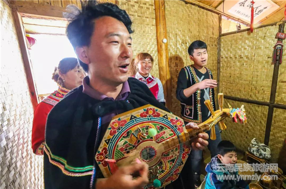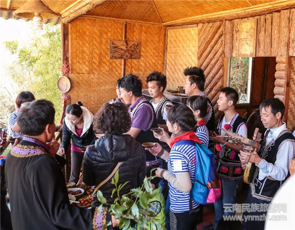 第一道稱為“攔門酒”,即在門口迎接客人。彝家人吹響長(zhǎng)號(hào)、嗩吶,彈起月琴,載歌載舞,歡唱迎客調(diào)??腿艘幌埋R,盛裝的彝族姑娘捧上一杯美酒,酒杯內(nèi)放有木葉,則表明要客人當(dāng)場(chǎng)回唱一首酒歌。