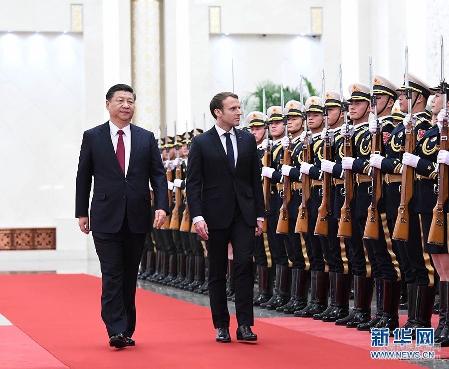 會談前,習近平在人民大會堂北大廳為馬克龍舉行歡迎儀式。習近平主席夫人彭麗媛,中共中央政治局委員、國務委員楊潔篪,全國人大常委會副委員長陳竺,全國政協(xié)副主席林文漪等參加。