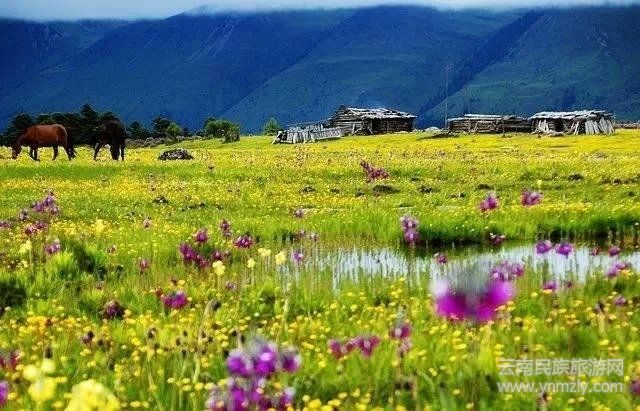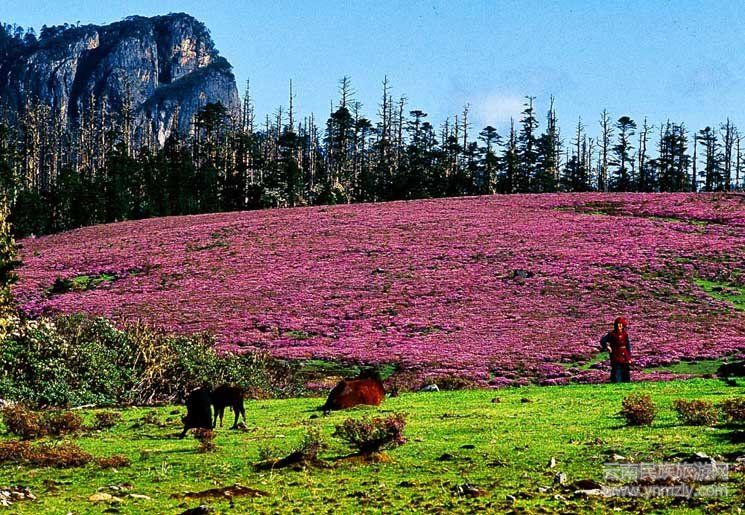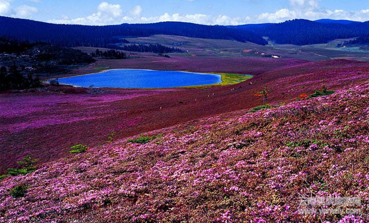 當高原花季來臨的時候,出香格里拉縣城,沿著214國道一直走,高山杜鵑、桃花爭相斗妍。千湖山風景區(qū)的天池花毯著實醉人。