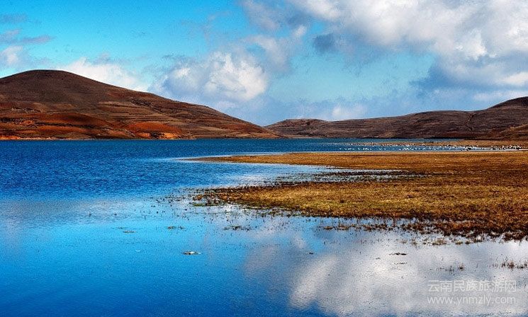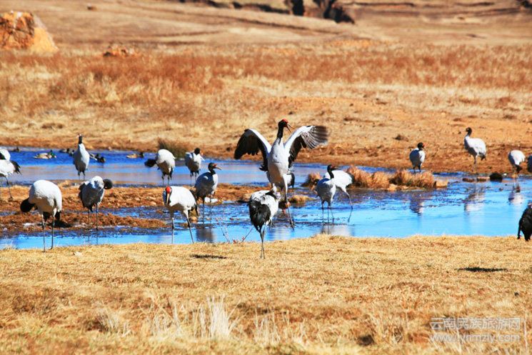大寶山更是世界瀕危珍稀物種黑頸鶴的溫馨家園。在跳墩河水庫、大海子水庫兩個地方可看到成群結(jié)隊的黑頸鶴在湖邊覓食、棲息,碩大的羽翼展翅于碧海藍天間,傲然飛翔。