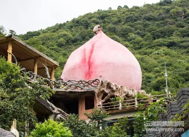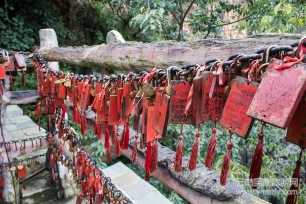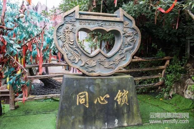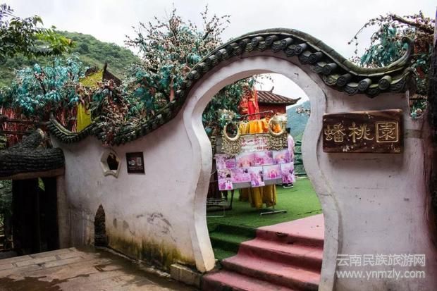 在五指山的旁邊有一個(gè)蟠桃園,進(jìn)入蟠桃園,古樸的氣息鋪面而來,站立的銅人,巨大的同心鎖以及鐵鏈上的許愿牌,看著這一切,不自覺的會(huì)想起《西游記》中王母壽宴,仙女去蟠桃園摘桃子的片段,這些小小的物件都為這里增加了很多趣味性。