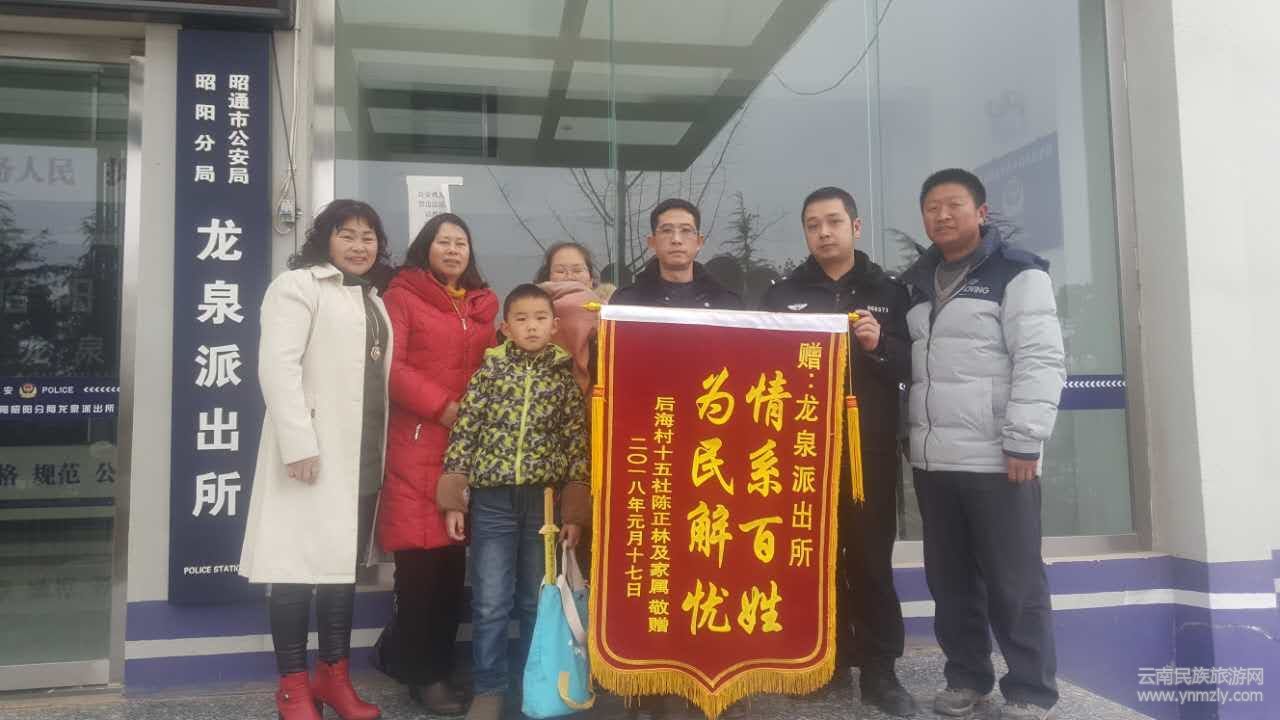2018年1月18日下午,陳正某老人的家人興高采烈地來到昭通市公安局昭陽分局龍泉派出所,激動地把一面寫有“情系百姓 為民解憂”的錦旗送到了民警手中,感謝民警在寒夜中把走失的陳正某老人送回家。