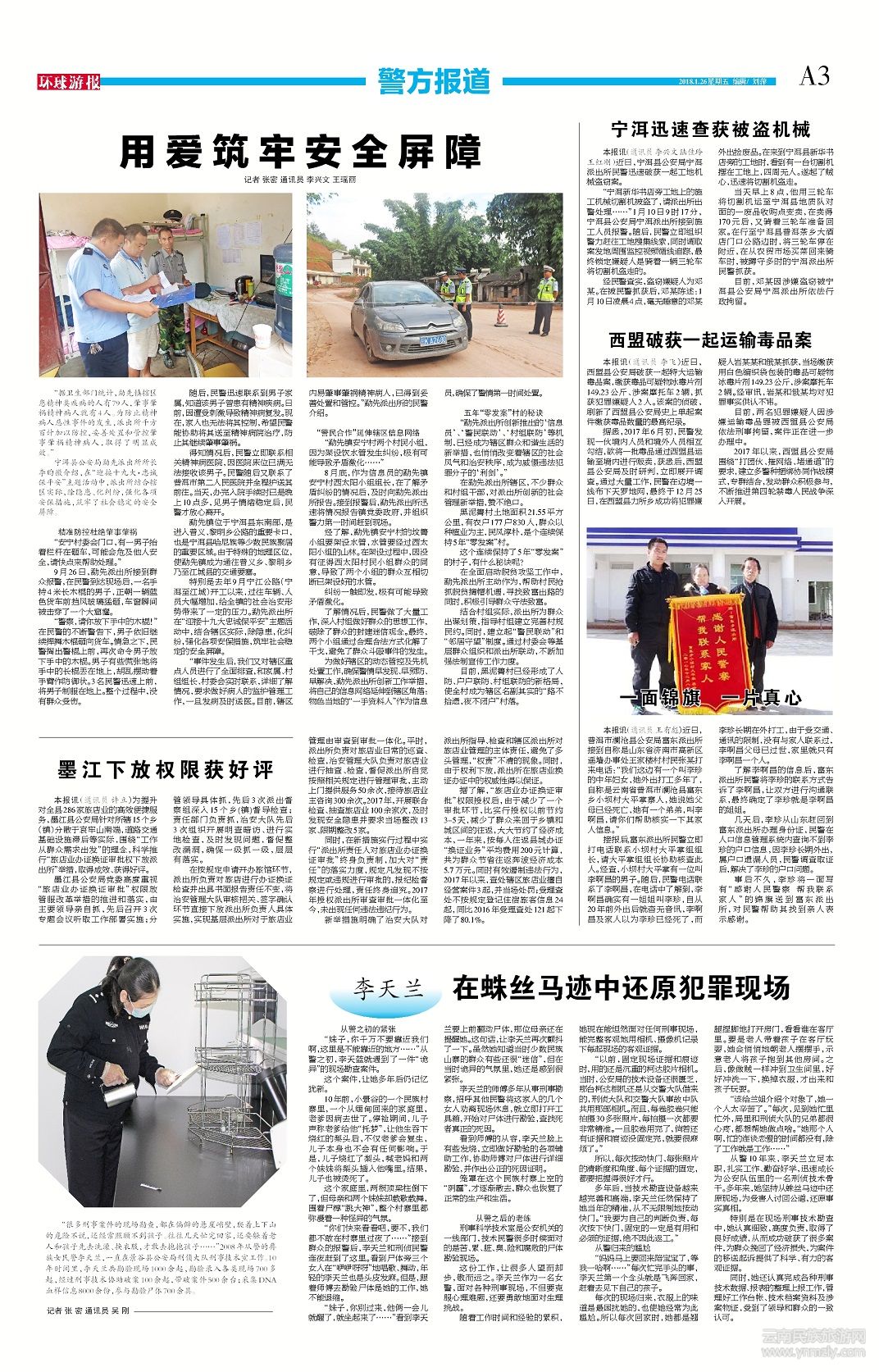 目前,黑泥箐村已經(jīng)形成了人防、戶戶聯(lián)防、村組聯(lián)防的新格局,使全村成為轄區(qū)名副其實(shí)的“路不拾遺,夜不閉戶”村落。記者 張密 通訊員 李興文 王瑤麗 (文章來源環(huán)球游報(bào)2018年1月26日第1126期A3版)