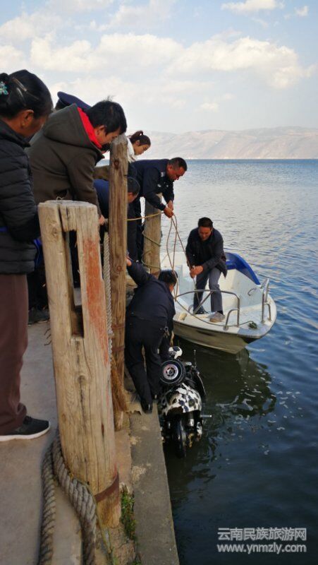 近日,一游客騎電瓶車在洱海游邊玩時,電瓶車不慎掉入洱海,報警后民警及時相助,將電瓶車從洱海打撈上岸。