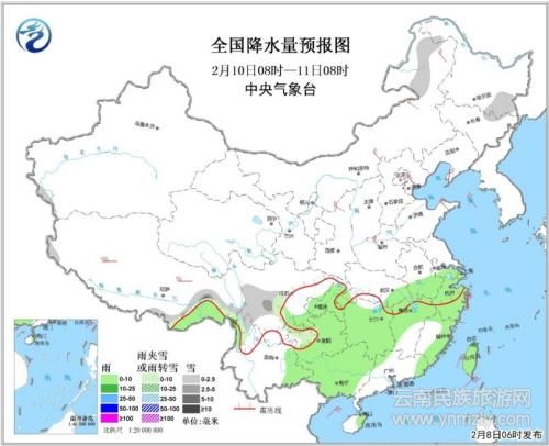 圖3 全國降水量預(yù)報(bào)圖(2月10日08時(shí)-2月11日08時(shí))