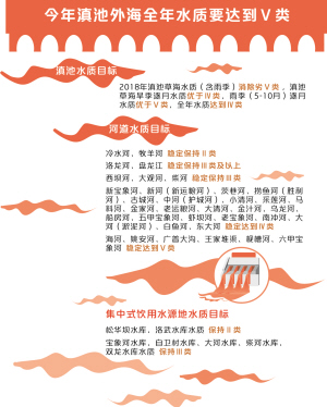 其中,2018年滇池草海水質(zhì)(含雨季)消除劣Ⅴ類,滇池草海旱季逐月水質(zhì)優(yōu)于Ⅳ類,雨季(5-10月)逐月水質(zhì)優(yōu)于Ⅴ類,全年水質(zhì)達(dá)到Ⅳ類;滇池外海全年水質(zhì)達(dá)到Ⅴ類。全面消除草海區(qū)域各支流溝渠劣Ⅴ類水體,基本消除外海區(qū)域各支流溝渠劣Ⅴ類水體。(具體水質(zhì)目標(biāo)見(jiàn)圖表)
