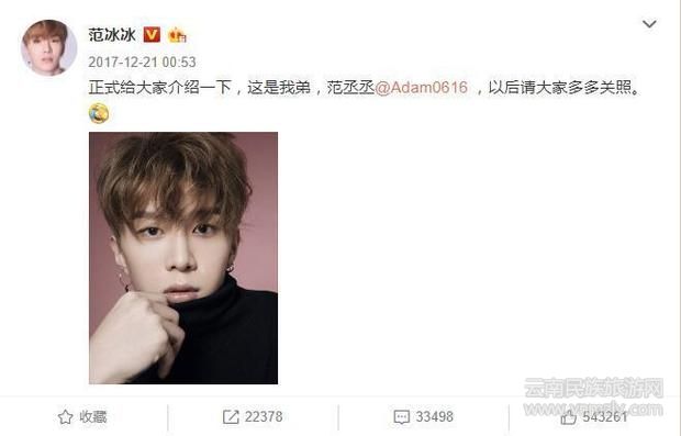 弟弟范丞丞準(zhǔn)備參加節(jié)目了,要出道了,范冰冰也會(huì)在微博上幫弟弟帶帶人氣,給粉絲隆重介紹,還請(qǐng)大家多多關(guān)照!