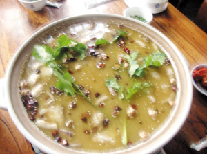 頂級(jí)推薦菜品:羊肉湯鍋。選自彝家人山上放羊的黑山羊,羊肉色澤黃亮,皮脆肉嫩,麻辣鮮香,湯汁乳白,軟爛醇香,半湯半菜,豐富多樣,佐以鹽水椒,別具風(fēng)味。俗話說(shuō),“冬吃羊肉賽人參,春夏秋食亦強(qiáng)身。”據(jù)《本草綱目》載,羊肉“暖中補(bǔ)虛,補(bǔ)中益氣,開(kāi)胃健力,益腎氣”,是助元陽(yáng)、補(bǔ)精血、益勞損之佳品。