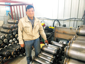 3月7日上午8點(diǎn),朝陽(yáng)剛露出頭,位于晉寧上蒜工業(yè)園區(qū)的云南宗安消防科技有限公司廠房?jī)?nèi)便閃出一陣陣光,50歲的蔣文留戴著面罩開始了一天的工作。這天,他的任務(wù)是將不平整的消防瓶修補(bǔ)完好。只見(jiàn)他右手握著電焊,左手拿著填補(bǔ)材料,動(dòng)作很熟練。5分鐘不到,1個(gè)瓶子便修補(bǔ)完成了。